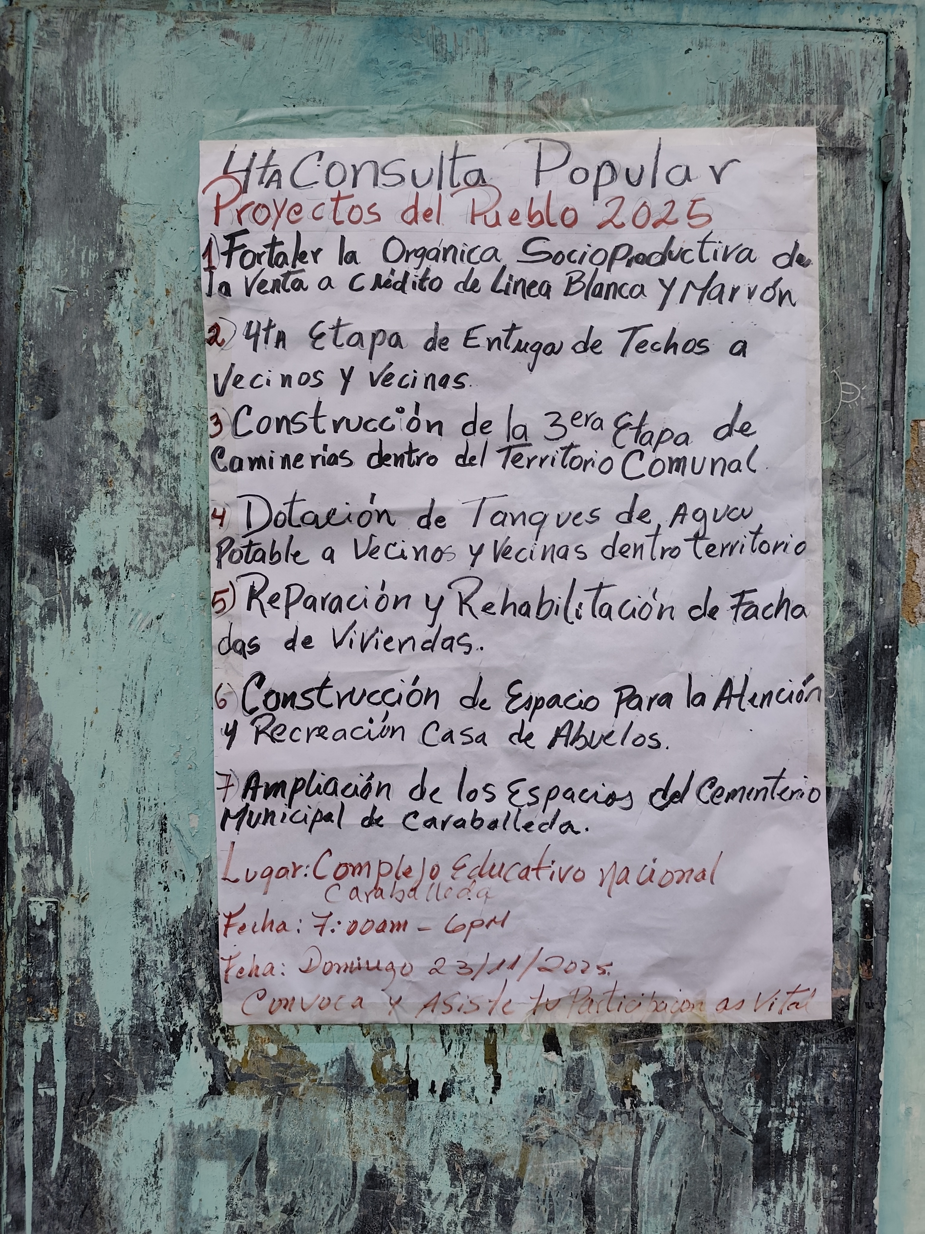 El passat 23 de novembre es va celebrar la quarta Consulta Popular Nacional (CPN) del 2025. Aquestes consultes s’introduiren a la vida política i econòmica de les Comunes el passat 2024. Consultes trimestrals, és a dir, quatre anuals per tal de d’escollir aquells projectes prioritaris per a cada realitat territorial organitzada en forma de Comuna. La democràcia comunal que s’exerceix en aquests processos de consultes populars ens mostra un projecte sociopolític i econòmic de governança des de les Comunes, és a dir des dels territoris, des de la proximitat, des de la coneixença, des de baix, des del pensament col·lectiu i comunitari.
